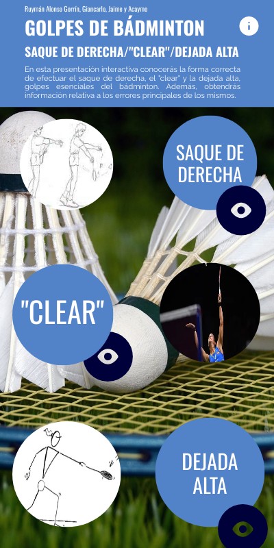 En esta presentación interactiva conocerás la forma correcta de efectuar el saque de derecha, el "clear" y la dejada alta, golpes esenciales del bádminton. Además, obtendrás información relativa a los errores principales de los mismos.