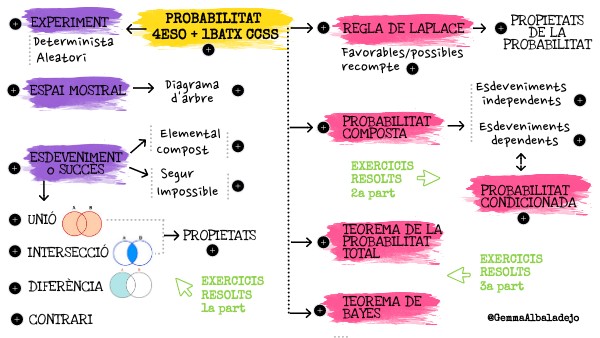 PROBABILITAT COMPOSTAS'obté quan es combinen diferents experiments simples de forma consecutiva, com ara llençar una moneda i un dau o treure tres cartes d'una baralla. Alhora de fer el recompte de casos possibles i faborables és molt útil utilitzar un diagrama d'arbre. La probabilitat d'un camí es calcula multiplicant les probabilitats de les seves branques. La probabilitat d'un esdeveniment es calcula sumant les probabilitats dels camins en els que succeeix. La suma de les probabilitats de tots els camins és sempre 1.