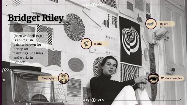 Bridget Riley was one of the first artists to explore optical illusions as a style of art. She was born in London, England on april 24. As she grew up she went to college to study art and eventually became an illustrator and an art teacher for children. Around 1960 she began to develop her signature op art style which consisted of black and white geometric patterns lines and colors. Op art is short for optical art and has everything to do with optical illusions. Lines colors and patterns play an important role in op art by placing these design elements next to each other. It plays a trick on our eyes and we can see the illusion of movement form and even different colors through optical mixing. Currently Bridget Riley is still living and working at the age of 89. She splits her time between london and France.