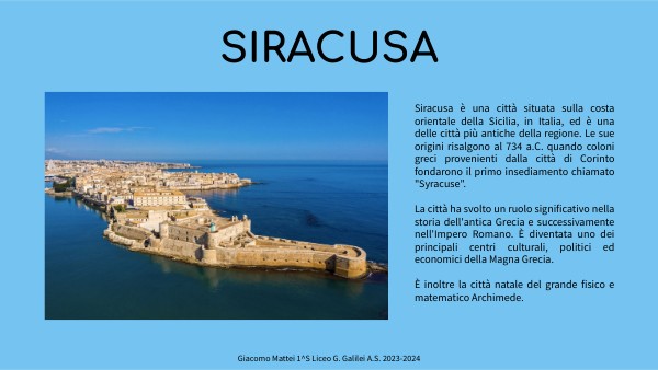 Siracusa è una città situata sulla costa orientale della Sicilia, in Italia, ed è una delle città più antiche della regione. Le sue origini risalgono al 734 a.C. quando coloni greci provenienti dalla città di Corinto fondarono il primo insediamento chiamato "Syracuse". La città ha svolto un ruolo significativo nella storia dell'antica Grecia e successivamente nell'Impero Romano. È diventata uno dei principali centri culturali, politici ed economici della Magna Grecia. È inoltre la città natale del grande fisico e matematico Archimede.