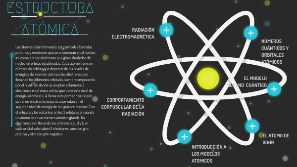 Los átomos están formados por partículas llamadas protones y neutrones que se encuentran en el núcleo, así como por los electrones que giran alrededor del núcleo en órbitas establecidas. Cada átomo tiene un número de orbitas que depende de los niveles de energía y del número atómico, los electrones van llenando los diferentes orbitales, siempre empezando por el nivel 1 en donde se aceptan solamente 2 electrones en el único orbital que tiene este nivel de energía, el orbital s, al llenar este primer nivel si aún se tienen electrones éstos se acomodan en el segundo nivel de energía de la siguiente manera: 2 en el orbital s y los restantes en los 3 orbitales p; cuando un átomo tiene un número atómico grande, los electrones van llenando los orbitales s, p, d y f, en cada orbital solo caben 2 electrones, uno con giro positivo y otro con giro negativo.