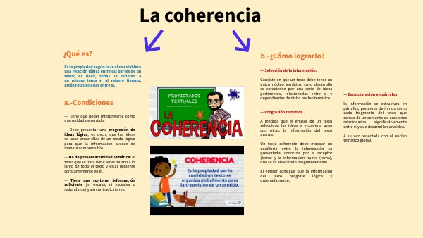 Es la propiedad según la cual se establece una relación lógica entre las partes de un texto; es decir, todas se refieren a un mismo tema y, al mismo tiempo, están relacionadas entre sí.