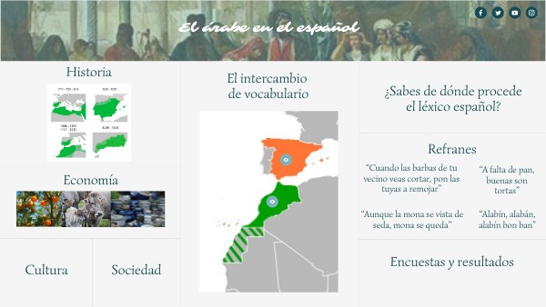 Hoy en día tenemos en nuestro vocabulario palabras del árabe debido a que una gran parte de la península estuvo ocupada por el Imperio Musulmán por más de ocho siglos. Los musulmanes llegaron en el 711 derrotando a los visigodos. El terreno ocupado que fue ocupado pasó de emirato dependiente a emirato independiente tras la subida al poder de los abasíes y más tarde pasó a ser un califato.
