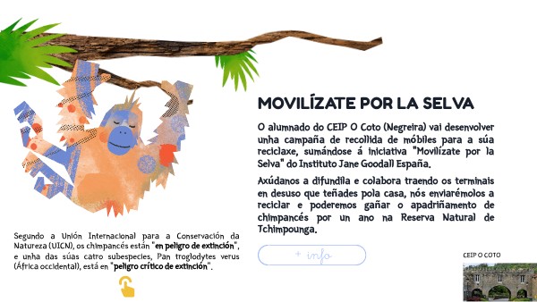 O alumnado do CEIP O Coto (Negreira) vai desenvolver unha campaña de recollida de móbiles para a súa reciclaxe, sumándose á iniciativa "Movilízate por la Selva" do Instituto Jane Goodall España. Axúdanos a difundila e colabora traendo os terminais en desuso que teñades pola casa, nós enviarémolos a reciclar e poderemos gañar o apadriñamento de chimpancés por un ano na Reserva Natural de Tchimpounga.