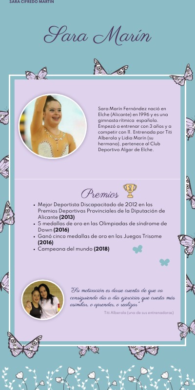 Sara Marín Fernández nació en Elche (Alicante) en 1996 y es una gimnasta rítmica española. Empezó a entrenar con 3 años y a competir con 11. Entrenada por Titi Alberola y Lidia Marín (su hermana), pertenece al Club Deportivo Algar de Elche.