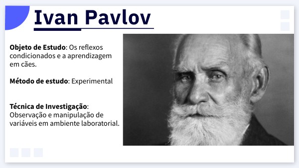 Pavlov dedicou-se ao estudo do comportamento salivar dos cães em resposta a estímulos ambientais – estudou os reflexos salivares. Investigou realidades objetivas, observáveis e mensuráveis.