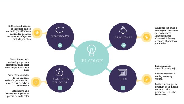 Los primarios: amarillo, azul y rojo. Los secundarios: el verde, naranja y violeta. Los terciarios: que se originan de la mezcla entre un color primario + un color secundario