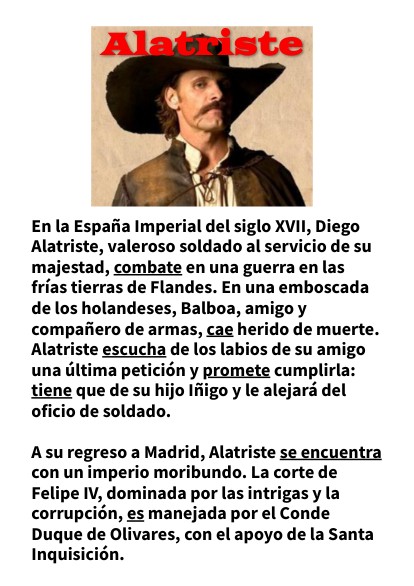 En la España Imperial del siglo XVII, Diego Alatriste, valeroso soldado al servicio de su majestad, combate en una guerra en las frías tierras de Flandes. En una emboscada de los holandeses, Balboa, amigo y compañero de armas, cae herido de muerte. Alatriste escucha de los labios de su amigo una última petición y promete cumplirla: tiene que de su hijo Iñigo y le alejará del oficio de soldado. A su regreso a Madrid, Alatriste se encuentra con un imperio moribundo. La corte de Felipe IV, dominada por las intrigas y la corrupción, es manejada por el Conde Duque de Olivares, con el apoyo de la Santa Inquisición.