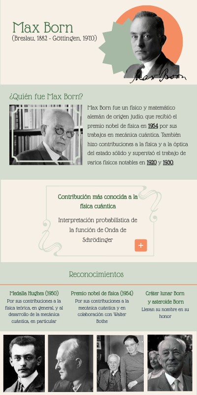Max Born fue un físico y matemático alemán de origen judío. que recibió el premio nobel de física en 1954 por sus trabajos en mecánica cuántica. También hizo contribuciones a la física y a la óptica del estado sólido y supervisó el trabajo de varios físicos notables en 1920 y 1930.