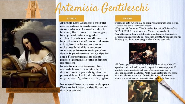 Artemisia Lomi Gentilesci è stata una pittrice italiana di scuola caravaggesca. Artimisia figlia di Orazio Gentileschi, famoso pittore e amico di Caravaggio , fu un greande artista in grado di rivelare il prprio talento e di riuscire a imporsi in una società tendenzialmente chiusa, in cui le donne non avevano molte possibilità di fare successo.Artemisia si dimostrò fin da piccolina dotata di grandissimo talento, e il padre cercò d'icoraggaire questo talento precoce insegnandole tutti i rudimenti del mestiere. L'episodio più noto della sua vita è quello della violenza subita all'età di diociotto anni da parte di Agostino, un pittore di buon livello, allo stupro seguì un processo e Agostino andò in prigione . Nel mese di Novembre, Artemisia sposa Pierantonio Stiattesi, artista fiorentino di mpdesta entità