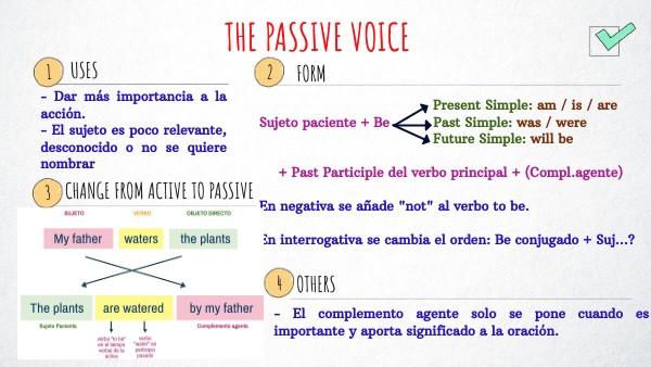 Present Simple: am / is / areSujeto paciente + Be Past Simple: was / were Future Simple: will be + Past Participle del verbo principal + (Compl.agente) En negativa se añade "not" al verbo to be. En interrogativa se cambia el orden: Be conjugado + Suj...?