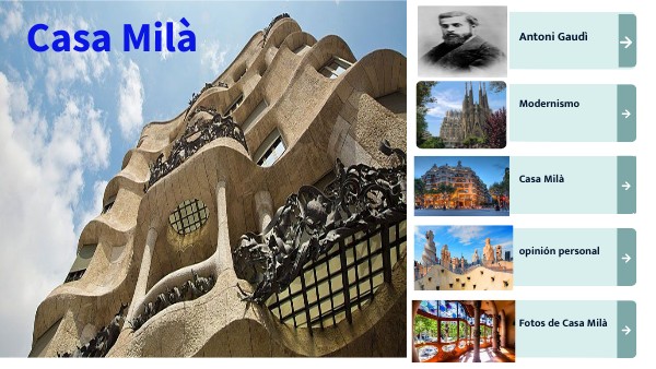 Yo pienso que las obras de Gaudì son llenas de particulares que te dejan con la boca abierta. Me gustaría visitar en futuro Barcelona y también estas increíbles obras como la Sagrada Familia, El Parque Güell, la casa Batló y sobre todo la casa Milà. Me gustó hacer este trabajo multimedia no solo para saber algo más sobre el argumento, sino tener conocimiento de algo antés de ir a visitar en futuro estas creaciones en primera persona sin explicación del porque el Artista quiso realizarlas.