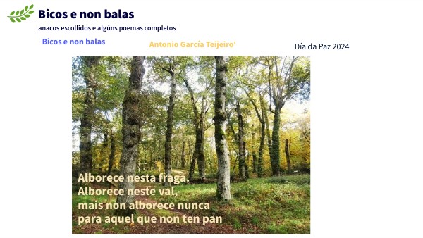 CANTAMOS ESA CANCIÓN, ESTA, AQUELA E MOITAS MÁIS, PARA QUE LIMPEN O SANGUE QUE TINXE AS ONDAS DO MAR. CANTAMOS ESA CANCIÓN, ESTA, AQUELA E MOITAS MÁIS PARA QUE OS SERES HUMANOS POIDAN COLLERSE DA MAN. CANTAMOS ESA CANCIÓN, ESTA, AQUELA E MOITAS MÁIS PARA QUE CERTAS FERIDAS POIDAN UN DÍA CERRAR. CANTAMOS ESA CANCIÓN, ESTA, AQUELA E MOITAS MÁIS PARA QUE AS AVES DO CEO NUNCA DEIXEN DE VOAR. CANTAMOS ESA CANCIÓN, ESTA, AQUELA E MOITAS MÁIS PARA QUE CUBRAN AS GUERRAS SABAS CON BRUMAS DE PAZ.