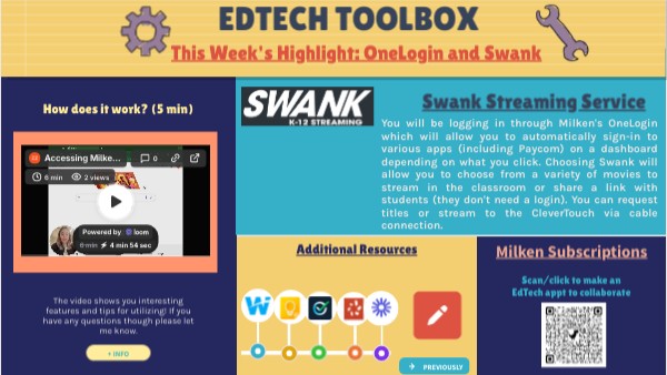 You will be logging in through Milken's OneLogin which will allow you to automatically sign-in to various apps (including Paycom) on a dashboard depending on what you click. Choosing Swank will allow you to choose from a variety of movies to stream in the classroom or share a link with students (they don't need a login). You can request titles or stream to the CleverTouch via cable connection.