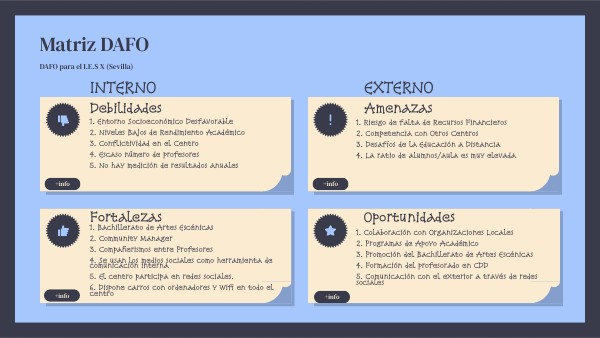 - Existen colaboraciones con organizaciones locales que ofrecen oportunidades para obtener recursos adicionales y apoyo a los estudiantes, como Actividades culturales sin costes. - Implementar programas específicos para ayudar a los estudiantes con bajos niveles académicos llamado (PROA+) que mejoran el rendimiento general y fomentan un ambiente educativo más positivo. Son clases por las tardes impartidas en el mismo centro por el mismo equipo educativo, el cual, es quien decide qué alumnos necesitan de dichas actividades. - Aprovechar la demanda del bachillerato de artes escénicas para promocionar el instituto y atraer más alumnos interesados en esta especialidad. - Oferta de programas y proyectos para formación del profesorado para acercar las competencias digitales para uso y manejo de los profesores. - El Instituto participa en redes sociales como Facebook, Instagram, Twitter, gracias a la labor del Community Manager, donde se publican actividades, excursiones, días de efemérides como medio de comunicación externo con antiguos alumnos, familiares, nuevos alumnos y personas interesadas en las enseñanzas del Instituto X.
