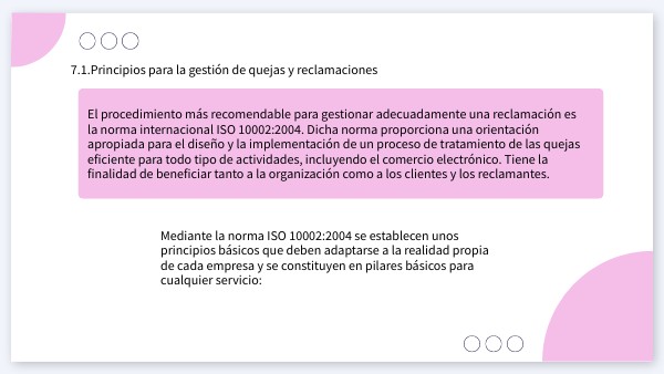 Mediante la norma ISO 10002:2004 se establecen unos principios básicos que deben adaptarse a la realidad propia de cada empresa y se constituyen en pilares básicos para cualquier servicio: