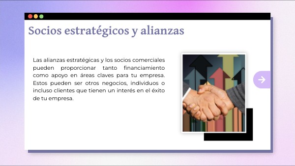 Las alianzas estratégicas y los socios comerciales pueden proporcionar tanto financiamiento como apoyo en áreas claves para tu empresa. Estos pueden ser otros negocios, individuos o incluso clientes que tienen un interés en el éxito de tu empresa.