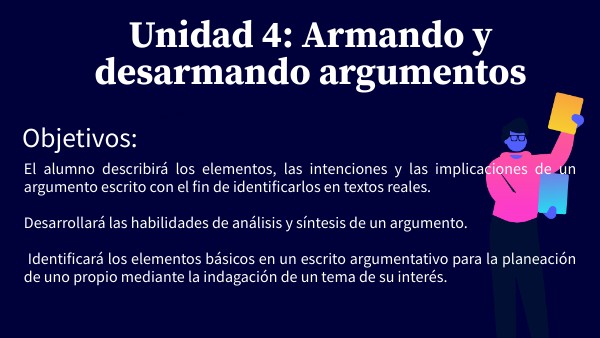 El alumno describirá los elementos, las intenciones y las implicaciones de un argumento escrito con el fin de identificarlos en textos reales. Desarrollará las habilidades de análisis y síntesis de un argumento. Identificará los elementos básicos en un escrito argumentativo para la planeación de uno propio mediante la indagación de un tema de su interés.