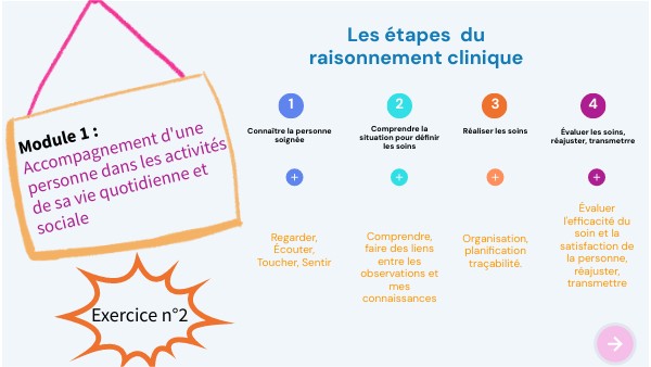 Bonjour à tous, je suis Capucine élève aide-soignante. Vous allez m'aider à construire mon raisonnement clinique. Pour cela vous allez trouver des éléments interactifs qui vont vous permettre de naviguer dans le génially. Passez la souris dessus