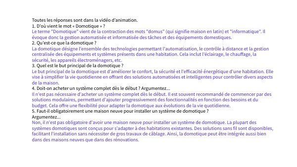 Toutes les réponses sont dans la vidéo d’animation. 1. D'où vient le mot « Domotique » ? Le terme "Domotique" vient de la contraction des mots "domus" (qui signifie maison en latin) et "informatique". Il évoque donc la gestion automatisée et informatisée des tâches et des équipements domestiques. 2. Qu'est-ce que la domotique ? La domotique désigne l'ensemble des technologies permettant l'automatisation, le contrôle à distance et la gestion centralisée des équipements et systèmes présents dans une habitation. Cela inclut l'éclairage, le chauffage, la sécurité, les appareils électroménagers, etc. 3. Quel est le but principal de la domotique ? Le but principal de la domotique est d'améliorer le confort, la sécurité et l'efficacité énergétique d'une habitation. Elle vise à simplifier la vie quotidienne en offrant des solutions automatisées et intelligentes pour contrôler divers aspects de la maison. 4. Doit-on acheter un système complet dès le début ? Argumentez... Il n'est pas nécessaire d'acheter un système complet dès le début. Il est souvent recommandé de commencer par des solutions modulaires, permettant d'ajouter progressivement des fonctionnalités en fonction des besoins et du budget. Cela offre une flexibilité pour adapter la domotique aux évolutions de la vie quotidienne. 5. Faut-il obligatoirement une maison neuve pour installer un système de domotique ? Argumentez... Non, il n'est pas obligatoire d'avoir une maison neuve pour installer un système de domotique. La plupart des systèmes domotiques sont conçus pour s'adapter à des habitations existantes. Des solutions sans fil sont disponibles, facilitant l'installation sans nécessiter de gros travaux de câblage. Ainsi, la domotique peut être intégrée aussi bien dans des maisons neuves que dans des rénovations.