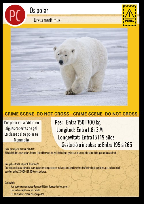 Breu descripció del seu hàbitat :El habitat dels osus polars és fred i tot el terra és de gel i tot nevat, gràcies a la seva pell groixuda fa que no passin fred. Per què es troba en perill d'extinció: Per culpa del canvi climatic esan pujan les temperatures més de lo normal i sestra desfentr el gel que hi ha, per culpa d'això quedan entre 22.000 i 31.000 osos polares. Curiositat:Has poden comunicarse domes utilitzan domes els seus peus. Corren tan ràpid com els caballs Els osus polars tenen tres párpados