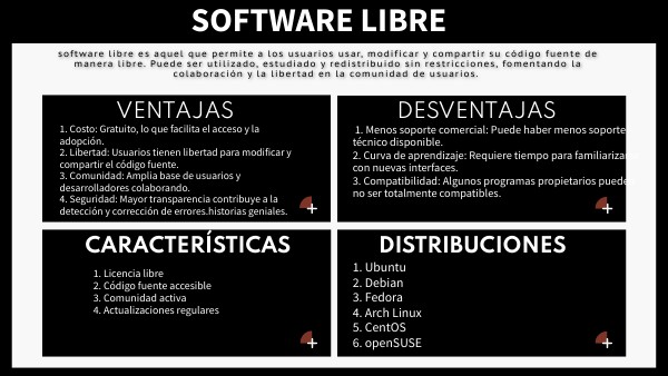 software libre es aquel que permite a los usuarios usar, modificar y compartir su código fuente de manera libre. Puede ser utilizado, estudiado y redistribuido sin restricciones, fomentando la colaboración y la libertad en la comunidad de usuarios.