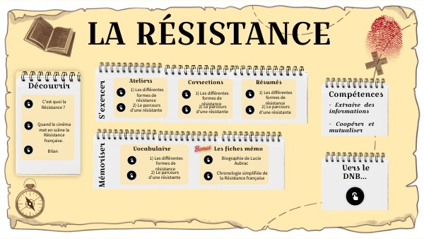 1. Regardez "C'est quoi la Résistance?" 2. Regardez "Quand le cinéma met en scène la Résistance." 3. Faites le bilan sur votre cahier.
