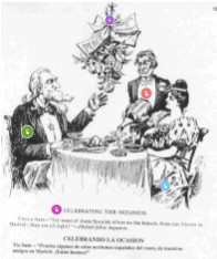 It's hard to see, but this server has a name badge that says "Sagasta." Who was Sagasta? Why did the artist decide to show Sagasta as a server pouring wine for Uncle Sam and his partner? Is there a difference in social status between Sagasta's true position and that of a server? What does this change suggest?
