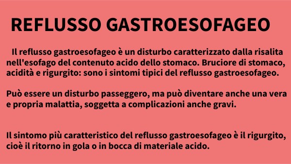 Il reflusso gastroesofageo è un disturbo caratterizzato dalla risalita nell'esofago del contenuto acido dello stomaco. Bruciore di stomaco, acidità e rigurgito: sono i sintomi tipici del reflusso gastroesofageo. Può essere un disturbo passeggero, ma può diventare anche una vera e propria malattia, soggetta a complicazioni anche gravi. Il sintomo più caratteristico del reflusso gastroesofageo è il rigurgito, cioè il ritorno in gola o in bocca di materiale acido.