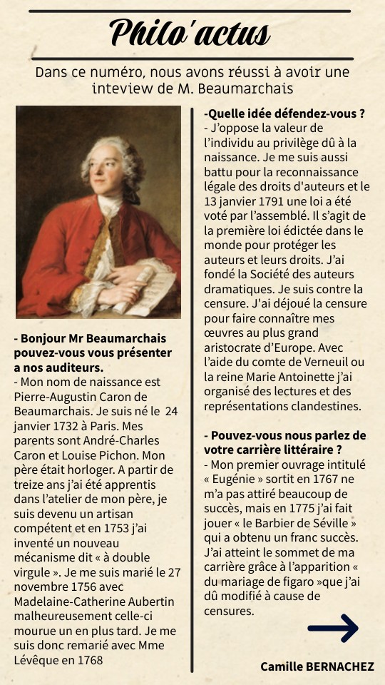 -Quelle a été votre rôle lors de la révolution ? Le soir du 14 juillet 1789, alors que des ouvriers commençaient à démolir la Bastille, j’y ai pénétré à la tète de 80 révolutionnaires. - Auriez-vous souhaiter vivre à une autre époque ? Je ne pense pas car être un philosophe des Lumières me permet de changer la société et puis je me sent utile et je me dit que mon passage sur terre aura servi à quelques choses. Et puis défendre ou attaquer une idée ou une loi à travers une pièce de théâtre c’est vraiment passionnant ! Merci de nous avoir accorder cette interview M. Beaumarchais, au revoir!