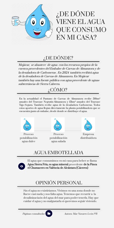 Sin el agua no existiríamos. Vivimos en una zona donde no llueve casi nada y nos falta agua. Tenemos que recurrir a la desalinizaciaón del agua del mar para poder tenerla. Hay que cuidar el agua y no malgastarla si queremos seguir viviendo.