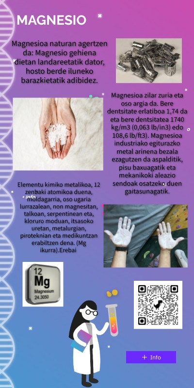 Elementu kimiko metalikoa, 12 zenbaki atomikoa duena, moldagarria, oso ugaria lurrazalean, non magnesitan, talkoan, serpentinean eta, kloruro moduan, itsasoko uretan, metalurgian, piroteknian eta medikuntzan erabiltzen dena. (Mg ikurra).Erebai