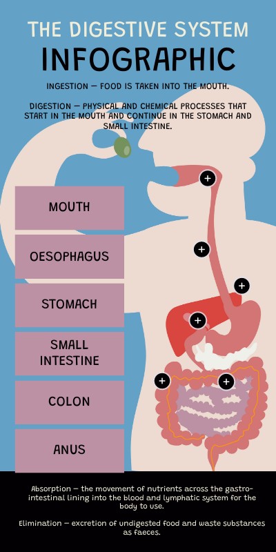 When food is swallowed, the muscles in the oesophagus contract and relax, helping to push the food down into the stomach. These waves of muscular contractions which move food along the digestive system are called peristalsis. Did you know? Each mouthful of food takes about six seconds to reach the stomach once it is swallowed. Even when the body is upside down, the food will still pass from the mouth to the stomach.