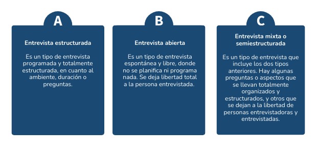 Entrevista mixta o semiestructurada Es un tipo de entrevista que incluye los dos tipos anteriores. Hay algunas preguntas o aspectos que se llevan totalmente organizados y estructurados, y otros que se dejan a la libertad de personas entrevistadoras y entrevistadas.