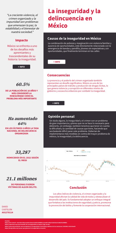 Fuentes: https://elcri.men/#:~:text=De%20acuerdo%20con%20el%20INEGI,usando%20las%20cifras%20del%20INEGI. https://coparmex.org.mx/el-desafio-de-la-inseguridad-en-mexico-urge-accion/ https://www.eleconomista.com.mx/opinion/La-inseguridad-el-principal-problema-de-los-mexicanos-20230912-0129.html# https://forojuridico.mx/causas-que-generan-la-inseguridad-en-mexico/