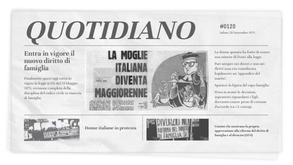 La donna sposata ha finito di essere una minore di fronti alla legge. Pari sempre nei doveri e non nei diritti essa era considerata legalmente un "appendice del marito". Sparisce la figura del capo famiglia: D'ora in avanti le decisioni, sopratutto riguardanti i figli, dovranno essere prese di comune d'accordo tra i 2 coniugi.