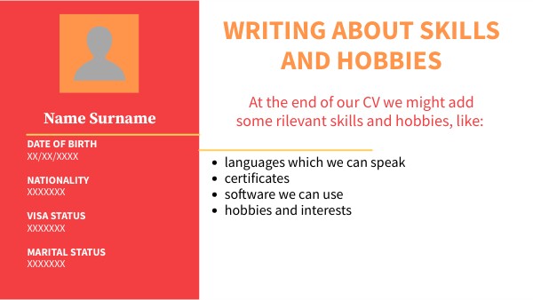 At the end of our CV we might add some rilevant skills and hobbies, like: