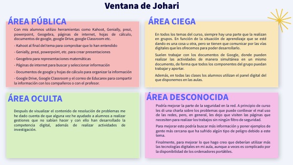 Con mis alumnos utilizo herramientas como Kahoot, Genially, prezi, powerpoint, Geogebra, páginas de internet, hojas de cálculo, documentos de google, google Drive, google Classroom etc. - Kahoot al final del tema para comprobar que lo han entendido - Genially, prezi, powerpoint, etc. para crear presentaciones - Geogebra para representaciones matemáticas - Páginas de internet para buscar y seleccionar información - Documentos de google y hojas de cálculo para organizar la información - Google Drive, Google Classroom y el correo de Educarex para compartir la información con los compañeros o con el profesor.