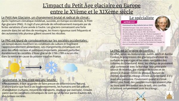 Après l’optimum climatique médiéval, succède, en Europe occidentale, le Petit Âge glaciaire (PAG). Il s’agit d’une période de refroidissement marquée par de fortes variations d’une année à l’autre. Les glaciers connaissent une forte avancée dans les val-lées de montagne, les hivers rigoureux sont fréquents et des automnes très pluvieux gâtent souvent les récoltes.