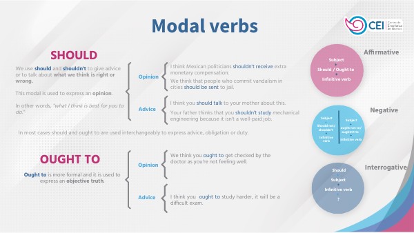 We use should and shouldn't to give advice or to talk about what we think is right or wrong. This modal is used to express an opinion. In other words, "what I think is best for you to do."