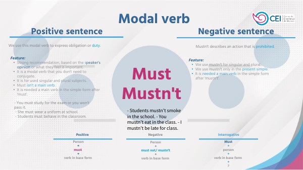 Feature: • Strong recommendation, based on the speaker's opinion or what they feel is important. • It is a modal verb that you don't need to conjugate. • It is for used singular and plural subjects. • Must isn't a main verb. • It is needed a main verb in the simple form after 'must'.