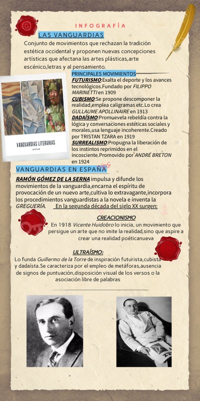 ULTRAÍSMO:Lo funda Guillermo de la Torre de inspiración futurista,cubista y dadaísta.Se caracteriza por el empleo de metáforas,ausencia de signos de puntuación,disposición visual de los versos o la asociación libre de palabras
