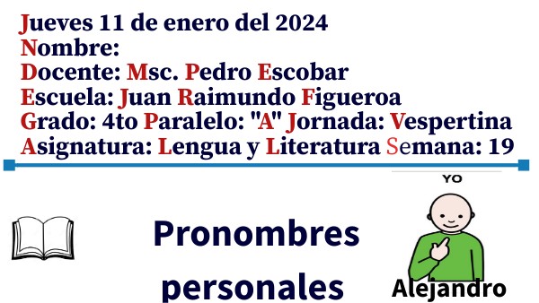 Jueves 11 de enero del 2024Nombre: Docente: Msc. Pedro Escobar Escuela: Juan Raimundo Figueroa Grado: 4to Paralelo: "A" Jornada: Vespertina Asignatura: Lengua y Literatura Semana: 19