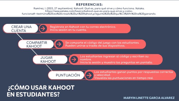 Ramírez, I. (2023, 27 septiembre). Kahoot!: Qué es, para qué sirve y cómo funciona. Xataka. https://www.xataka.com/basics/kahoot-que-es-para-que-sirve-y-como-funciona#:~:text=Una%20vez%20creado%20un%20Kahoot,pregunta%20y%20qui%C3%A9n%20va%20ganando.