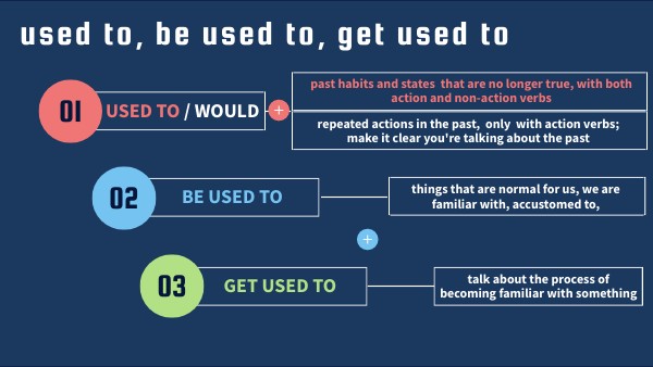 I got used to... I don't think I could ever get used to... I am getting used to... I have/need to get used to... I would easily get used to...