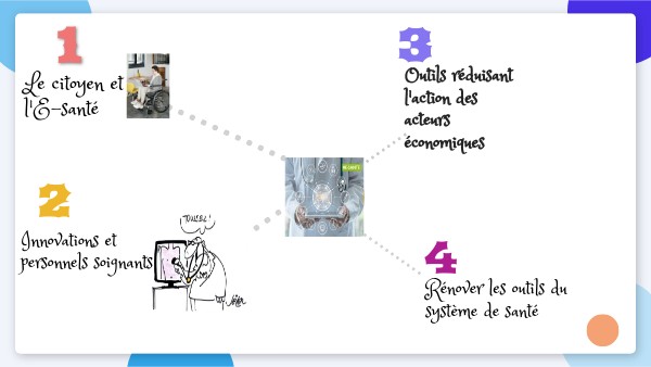 1. Télémedecine outil majeur de l'accès aux soins pour tout le monde et un appui pour le professionnel de santé prise en charge des patients les plus complexes ou celle des pathologies rares. 2. Simplifier les démarches administratives Les séjours hospitaliers peuvent être optimisée via des « portails patients ». Avantages de ces portails: facilitent les prises de rendez-vous et leur rappel, la préparation des hospitalisations, la communication par messagerie, le renouvellement d’ordonnance, les relations administratives, le suivi à domicile post-opératoire accès direct aux données du dossier médical partagé (DMP) par le patient et doit être enrichi en lui offrant la possibilité de télécharger le contenu sur une application mobile 3. Mieux informer sur la santé et l’offre de soins L'e- santé permet d'avoir un meilleur accès aux informations sur la santé. Il peut donc devenir un acteur de santé 4. Mieux informer sur la santé et l’offre de soins programmes d’éducation thérapeutique,arrivée des objets connectés, services de télésuivi --------> Patient plus autonomes sur sa santé développement de labels pour guider les patients et les professionnels de santé dans le choix d’objets connectés fiables et médicalement pertinents 5.Promouvoir l’expression collective des patients et citoyens L'Etat influence le déploiement des usages du numérique par les associations à travers des appels à projets,
