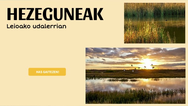 1-Hezegunen inbentarioa eta horren onurak. 2- Eguraldia 3-Haien egoera 4-EAE-ko hezegunen inbentarioa. 5-Haien egoera 6-Leioako hezeguneak: 6.1 Lertutxe urtegiko hezegunea: 6.1.1Ezaugarriak 6.1.2Ingurune naturala(fauna, flora...) 6.2 Astrabudua ibarreko hezegunea: 6.2.1Ezaugarriak 6.2.2Ingurune naturala(fauna, flora..) 6.3 Lamiako ibarrako hezeguneak: 6.3.1Ezaugarriak 6.3.2Ingurune naturala(fauna, flora...) 7- Hausnarketa