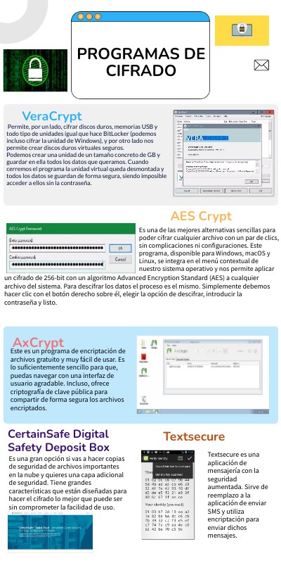 Permite, por un lado, cifrar discos duros, memorias USB y todo tipo de unidades igual que hace BitLocker (podemos incluso cifrar la unidad de Windows), y por otro lado nos permite crear discos duros virtuales seguros. Podemos crear una unidad de un tamaño concreto de GB y guardar en ella todos los datos que queramos. Cuando cerremos el programa la unidad virtual queda desmontada y todos los datos se guardan de forma segura, siendo imposible acceder a ellos sin la contraseña.