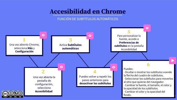 Puedes:- Ocultar o mostrar los subtítulos usando la flecha del cuadro de subtítulos. - Seleccionar los subtítulos para moverlos al sitio que quieras del navegador. - Cambiar la fuente, el tamaño, el color y la opacidad de los subtítulos. - Cambiar el color y la opacidad del fondo.