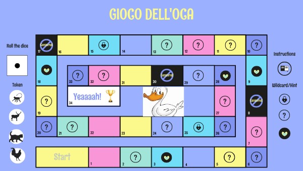 REGOLE DEL GIOCO • Clicca sull’icona del dado e trascina la pedina che rappresenta il tuo gruppo. • Quando arrivi su una casella con il PUNTO INTERROGATIVO leggi e rispondi alla domanda. • Attenzione: in caso di risposta sbagliata retrocedi di una casella. • Durante il percorso incontrerai dei CUORICINI: sono dei bonus (leggi quale vantaggio hai ottenuto!) • Attenzione: potresti poi capitare sulle caselle RISCHIO (Censored e lucchetto) retrocedendo fino allo Start o saltando il turno. BUON DIVERTIMENTO